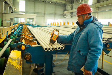 质检员对不锈钢管进行质检。人民网记者 王帆摄