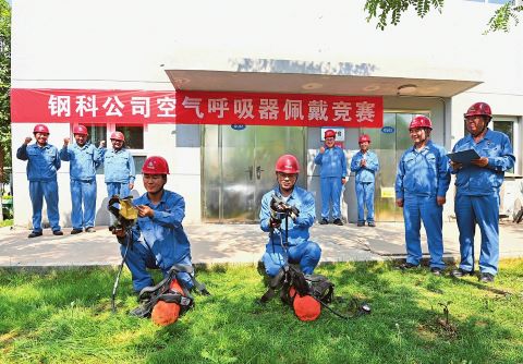 钢科公司空气呼吸器佩戴竞赛现场。 王瑞瑞 摄