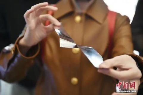 图为记者体验0.02mm“手撕钢”。中新网记者 李骏 摄