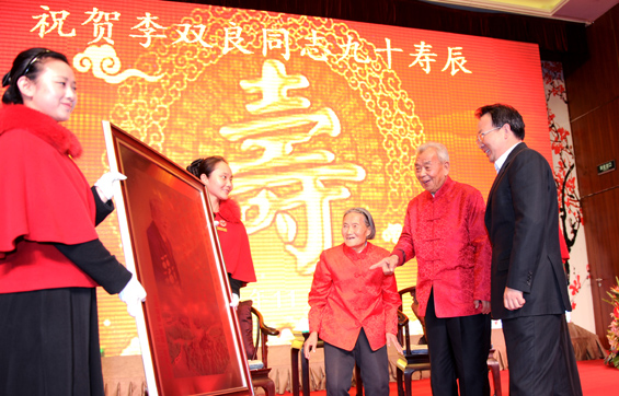 当身着红色唐装的李双良及其老伴儿在工作人员的搀扶下步入大厅时,全场响起了热烈的掌声。虽然双良老人已经90高龄,但依旧精神矍铄,不断向前来祝寿的各级领导和亲朋好友表示谢意。