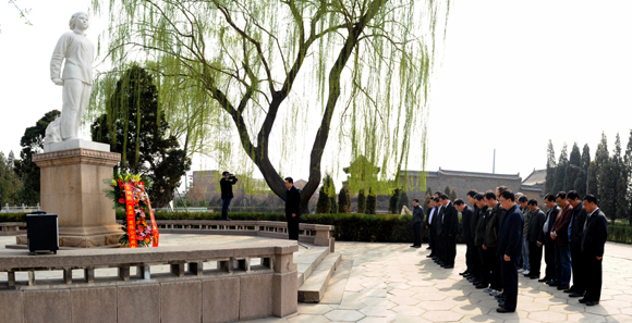 4月10日,太钢党委中心组举行革命传统教育活动。这是在刘胡兰塑像前缅怀先烈的情景。白治斌 摄